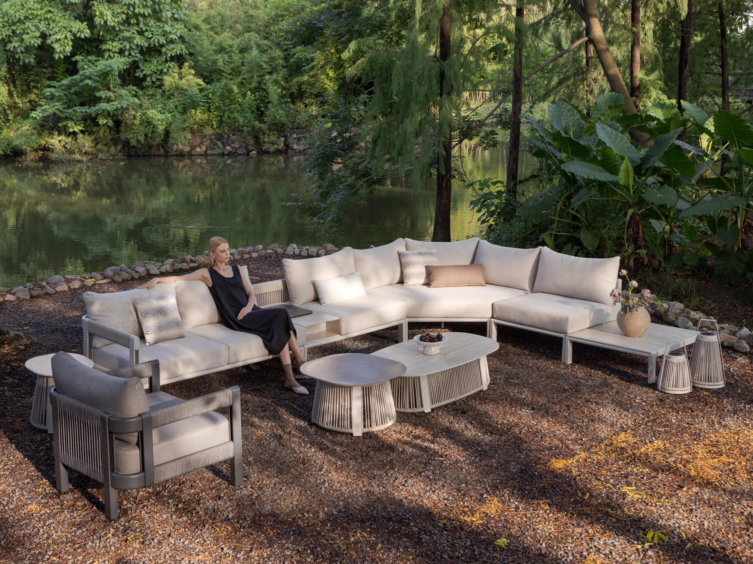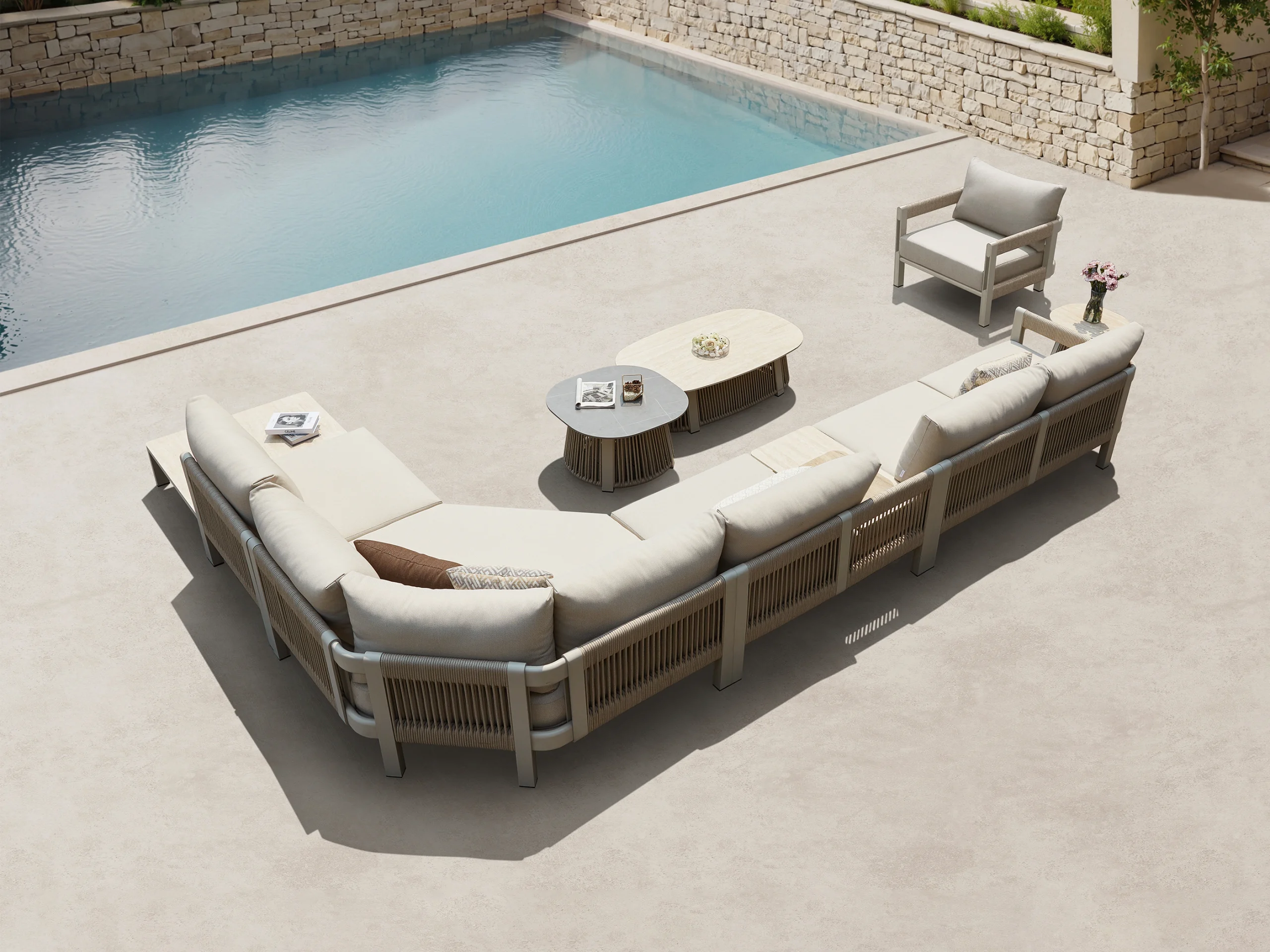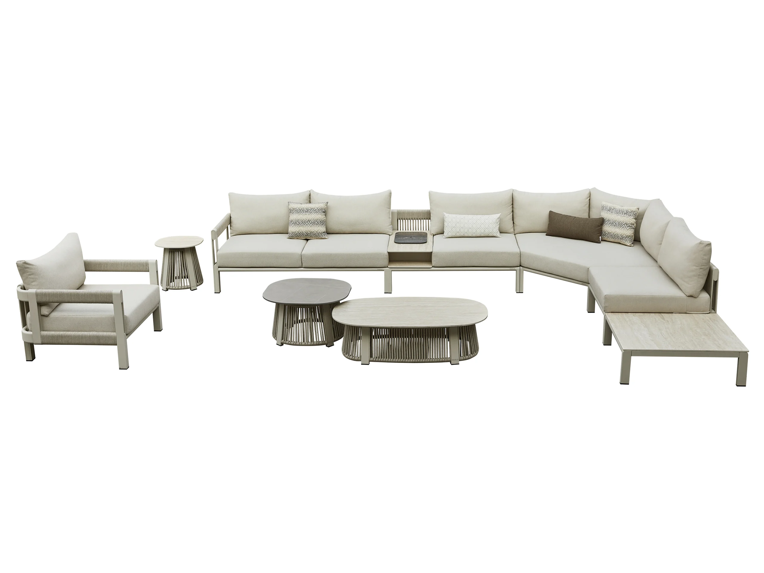 Masute de cafea rotunde si o masa auxiliara, proiectate in diferite inaltimi completeaza setul de coltar, oferind multiple posibilitati de aranjare si mult spatiu de depozitare. Blaturile sunt fabricate din piatra sinterizata cu grosimea de 11 mm, asigurand durabilitate si rezistenta. Ca bonus, coltarul Paros are o galeata de gheata functionala incorporata direct in designul produsului. Galeata in sine este fabricata din otel inoxidabil, in timp ce capacul este fabricat din HPL, oferind atat capacitati de depozitare cat si de racire a bauturilor.