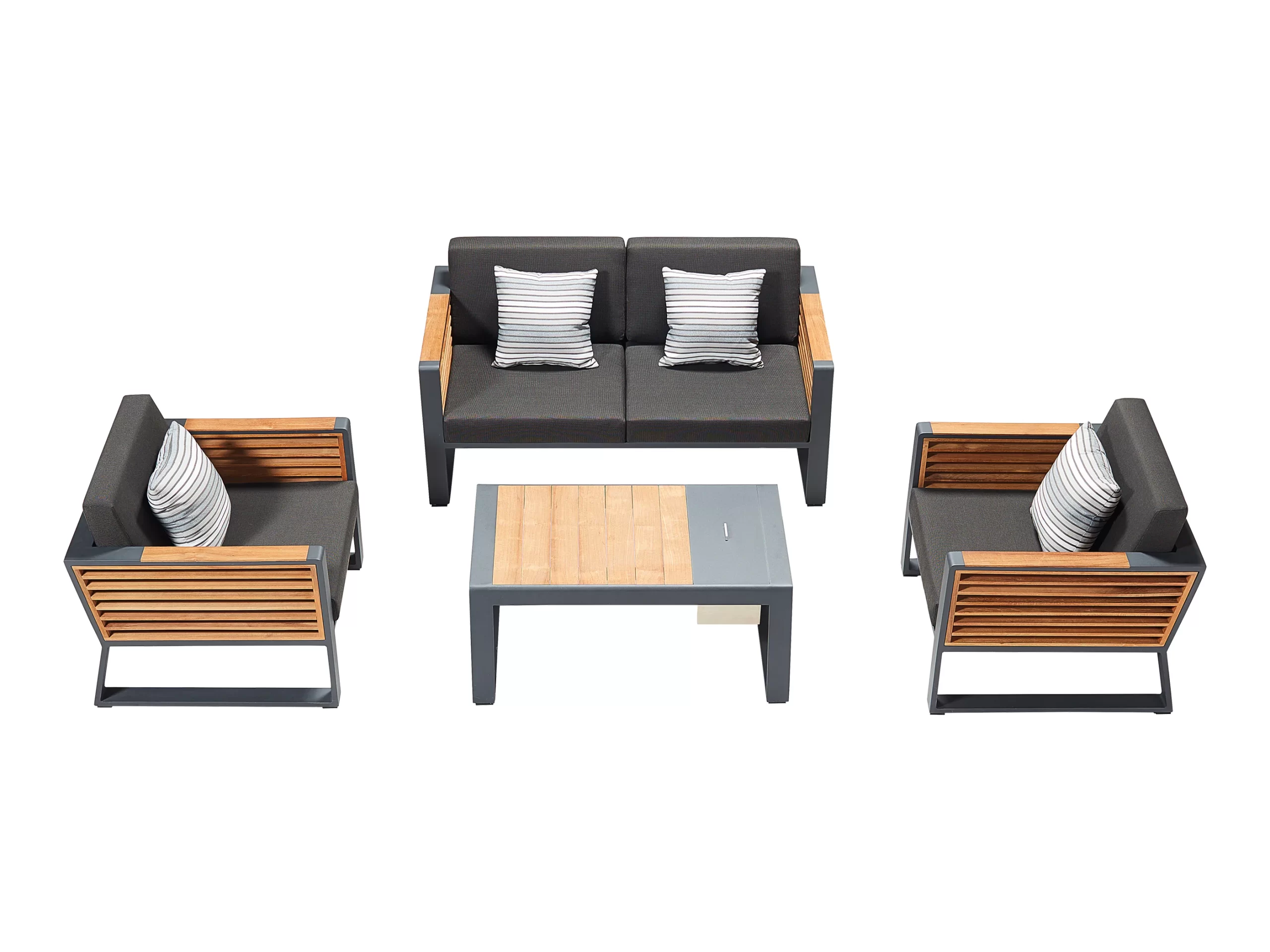 Setul de mobilier Higold New York include o canapea dubla, doua fotolii si o masuta de cafea. Cadrul mobilierului este realizat din aluminiu acoperit cu vopsea pulbere, care prezinta o rezistenta la deteriorarea mecanica si la factorilor externi nefavorabile. Structura metalica este combinat cu elemente din lemn de tec si cu tapiterie moale si confortabila, creand un ansamblu armonios un aspect coerent.