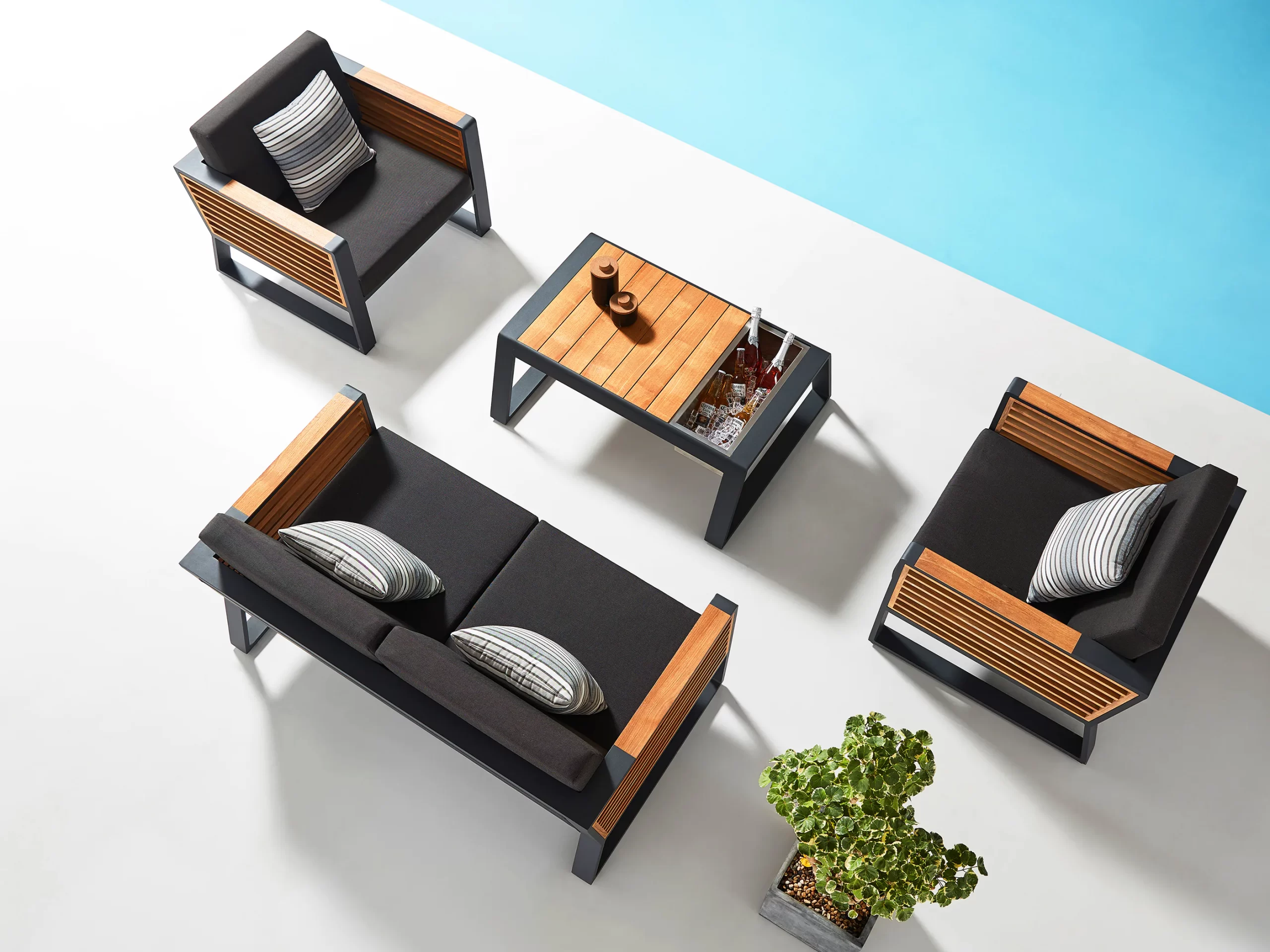 Masuta de cafea este echipata cu un blat din lemn de tec si un compartiment de depozitare inchisa. Setul include perne decorative cu umplutura de spuma si cu huse cu fermoar detasabile si lavabile.
