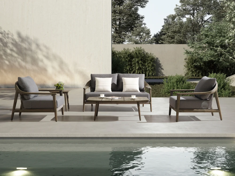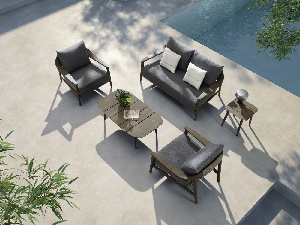 Setul de mobilier Higold Leo include o canapea cu doua locuri, doua fotolii si o masuta de cafea. Cadrul mobilierului este realizat din lemn de tec FSC de calitate superioara, cu aspect frumos. Sezutul pieselor din aceasta colectie este unul deosebit de gros si confortabil. Toate pernele de sezut si spatar sunt prevazute cu huse din material acrilic de calitate superioara, rezistente si placute la atingere.