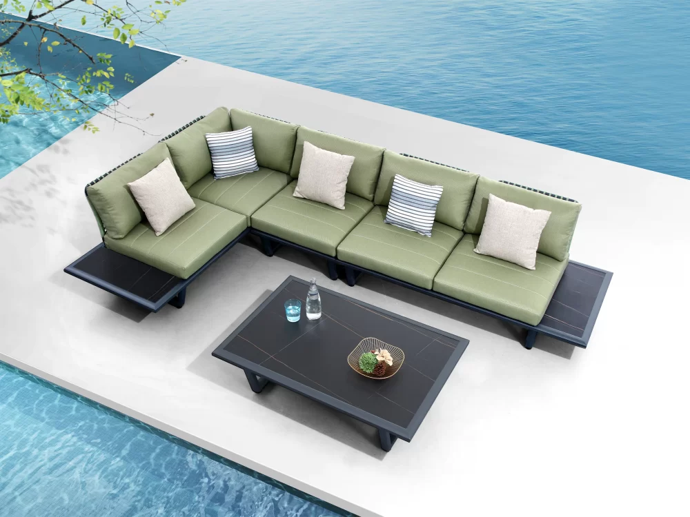 Colectia Sophia 2.0 este realizata in intregime din aluminiu antracit. Structura din aluminiu sustine pernele din spuma cu uscare rapida, cu huse din olefin resistente la intemperii, in culoarea cactus. Sfoara impletita folosita pentru sustinerea spatarelor are tot culoarea verde cactus. Blaturile si suporturile de pe partile laterale ale canapelelor sunt realizate din piatra sintetica neagra. Coltarul este format din doua canapele, un element central si o masuta de cafea. Combinatia culorilor contrastante rezulta intr-un set cu un puternic impact estetic.